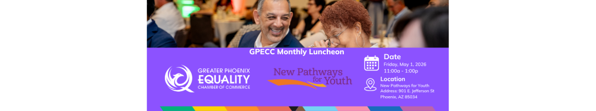 EVENTS Equality Chamber Luncheon Date and Time Friday May 1, 2026 11:00 AM - 1:00 PM MST Location New Pathways for Youth 901 E. Jefferson St. Phoenix, AZ 85034 Fees/Admission $36 for members $48 for future members Set a Reminder Enter your email address below to receive a reminder message. Email address Select the amount of Days before the event -- Select Days Before Event -- 1 Day 2 Days 3 Days 1 Week Captcha Validation Please complete the Captcha Submit Event Sponsors Set a Reminder Enter your email address below to receive a reminder message. Email address Select the amount of Days before the event -- Select Days Before Event -- 1 Day 2 Days 3 Days 1 Week Captcha Validation Please complete the Captcha Submit Share × Print Email Add to Calendar Facebook Twitter LinkedIn Tell a Friend × Select Calendar Type × Google Yahoo iCal (Outlook, Apple, or other)